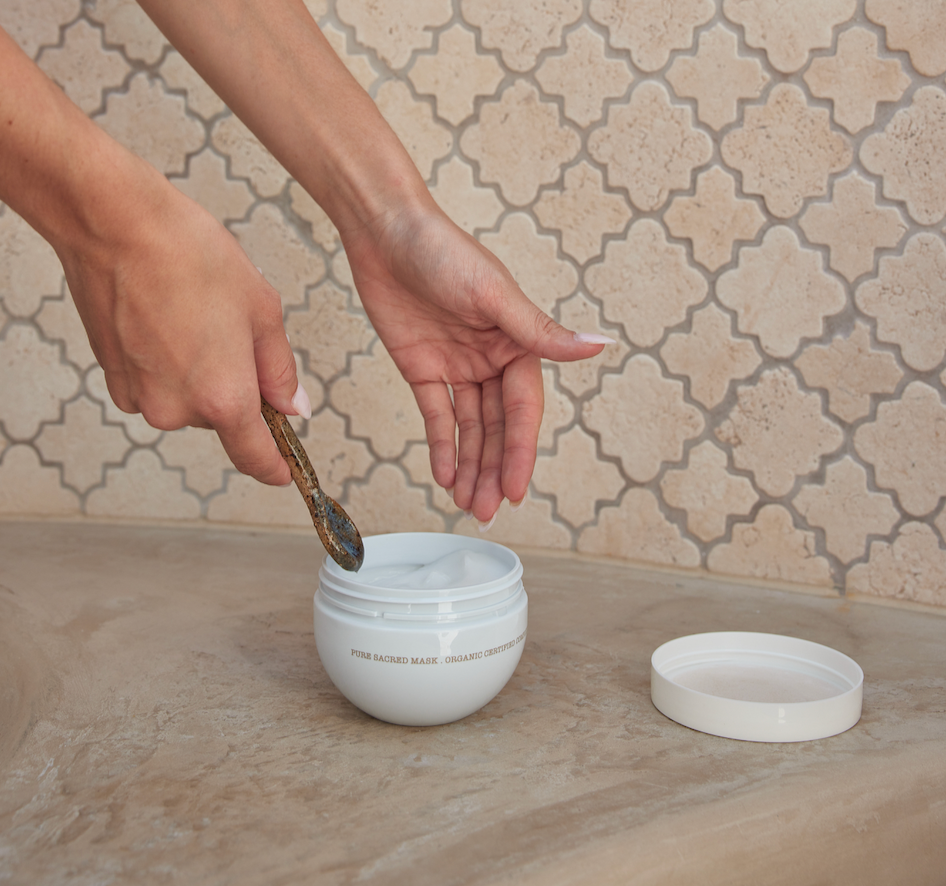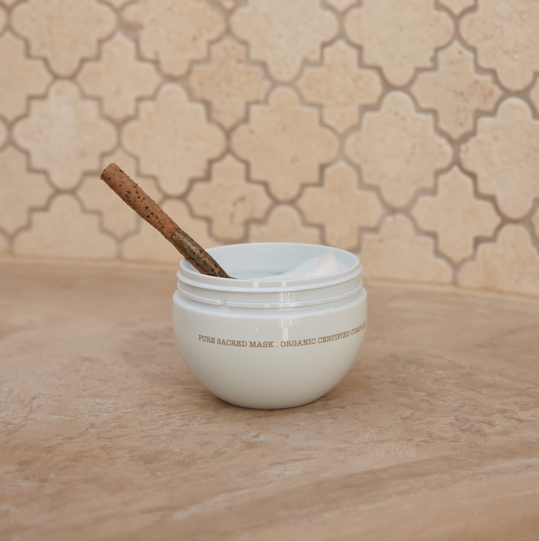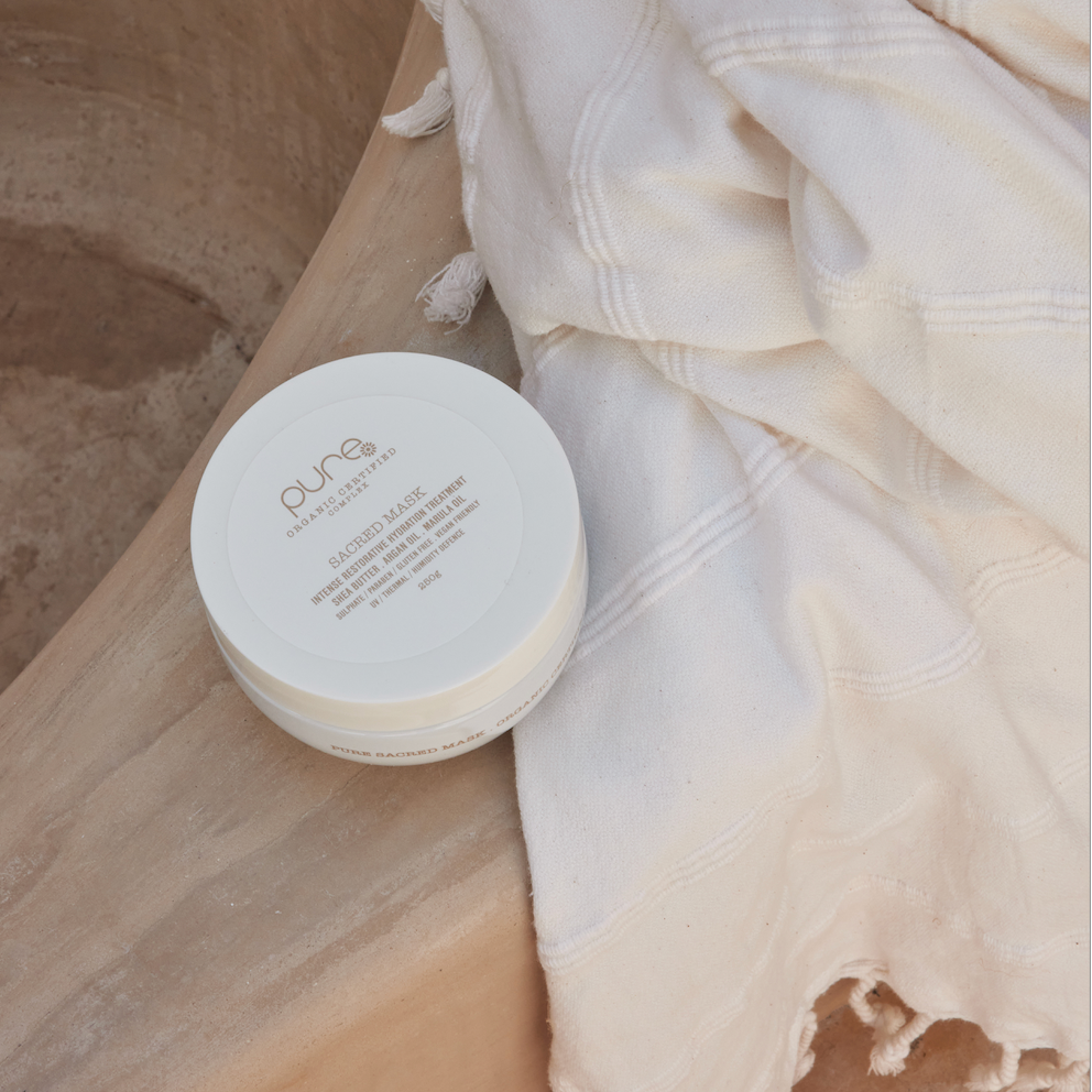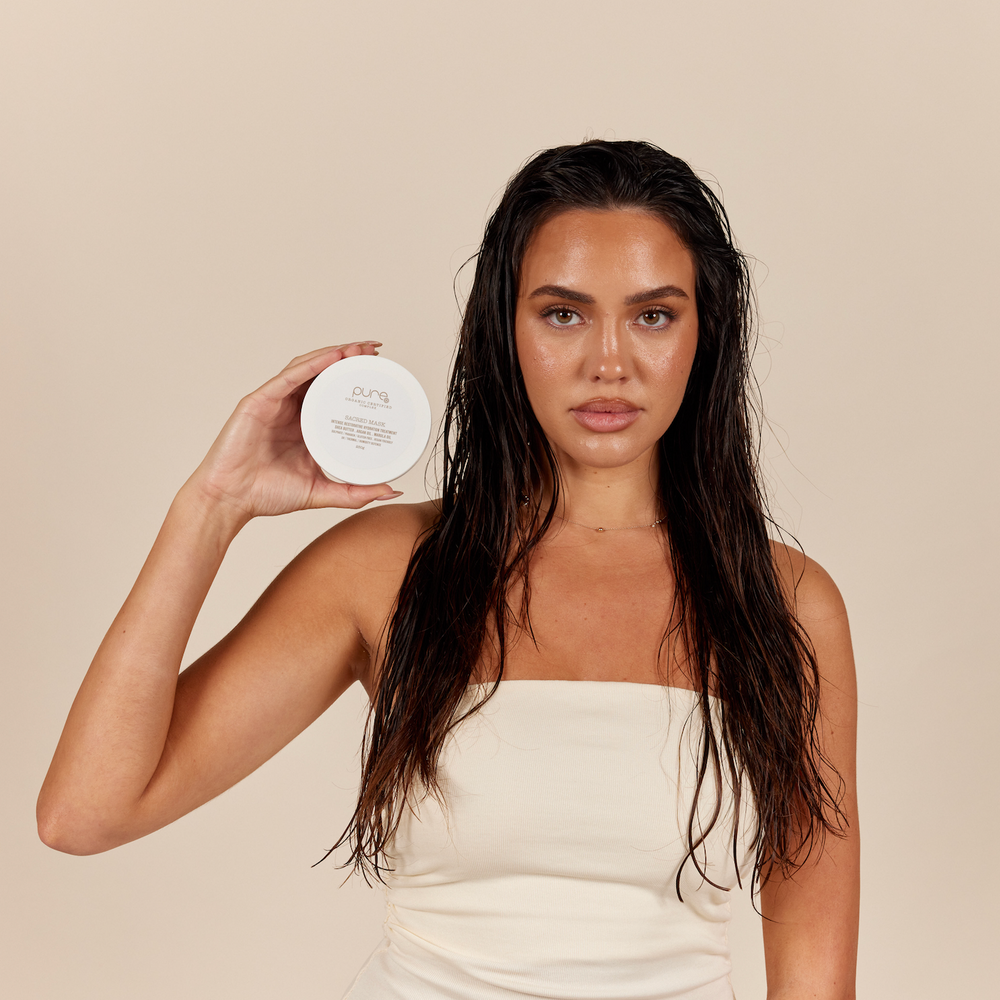 Apply Sacred Mask generously through mid-lengths and ends, ensuring even coverage. Leave on for 3–5 minutes.